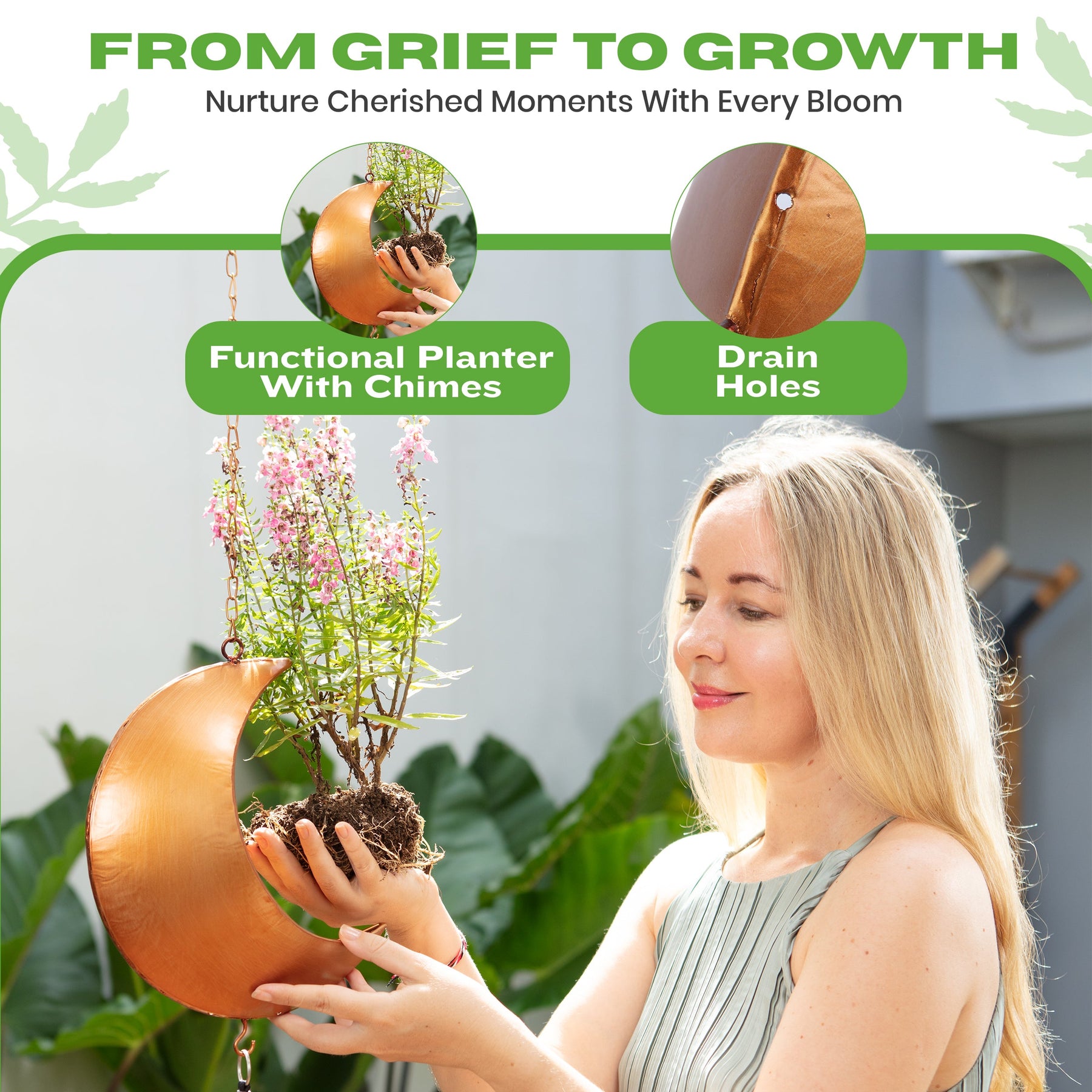 Elegant 9” Crescent Moon Planter – A patented design that blends artistry and function. The moon-shaped planter finished in antique gold is 9” long by 4” deep—ideal for succulents, florals, or keepsakes in your memorial wind chime. Plant a flower for a loved one.