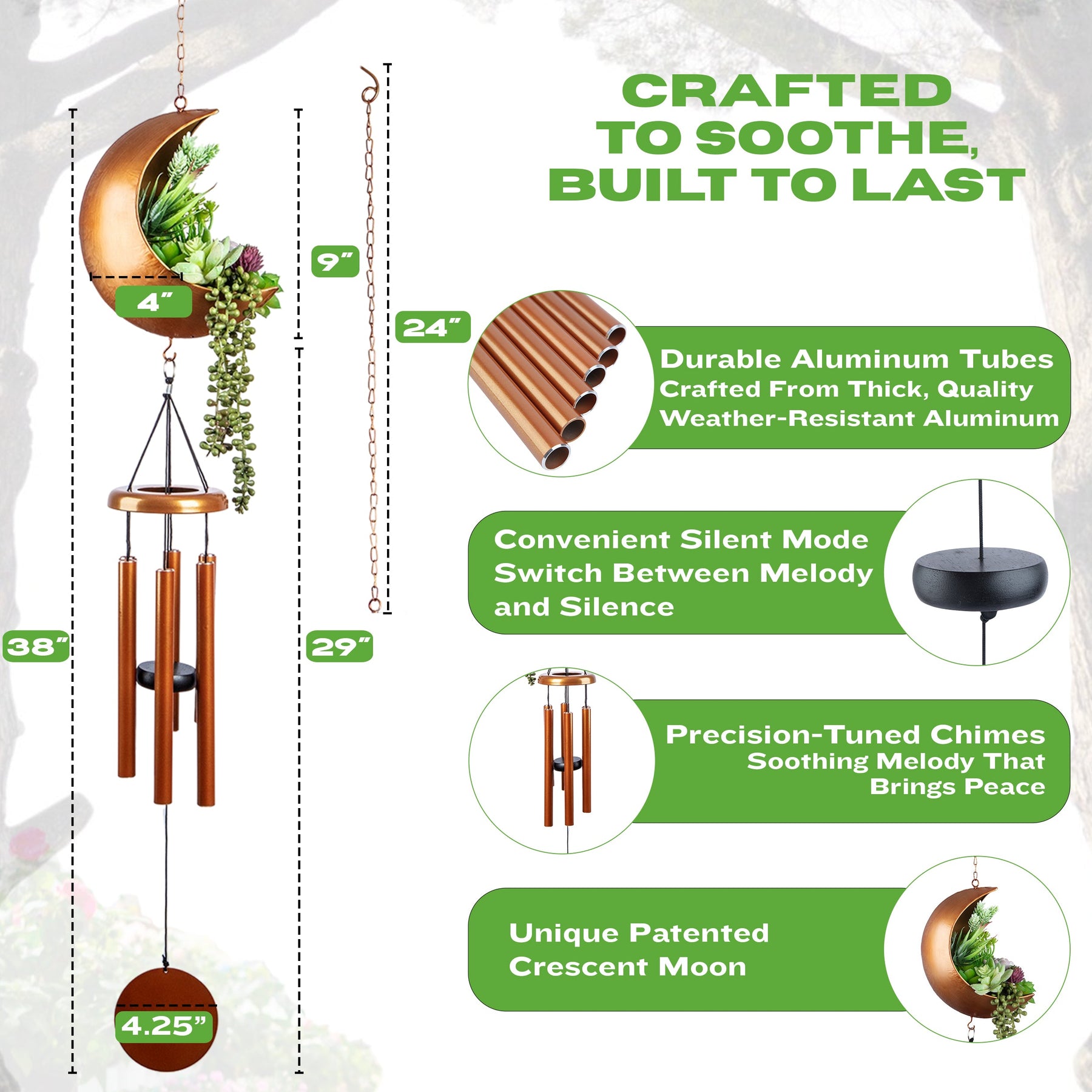 Built for Outdoor Beauty – Crafted with thick aluminum tubes and a corrosion-resistant metal frame, these 29” sympathy wind chimes (with moon planter) reach a total length of 38” and hang securely from a 24” chain and hook.